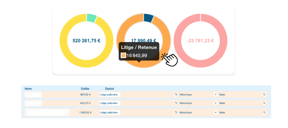 Si vous choisissez le graphique « orange » vous affichez les clients qui sont en litiges judiciaires. Le schéma « noir » correspond aux clients qui ont fait une faillite ou sont en PRJ, donc la somme est perdue soit partiellement ou totalement.